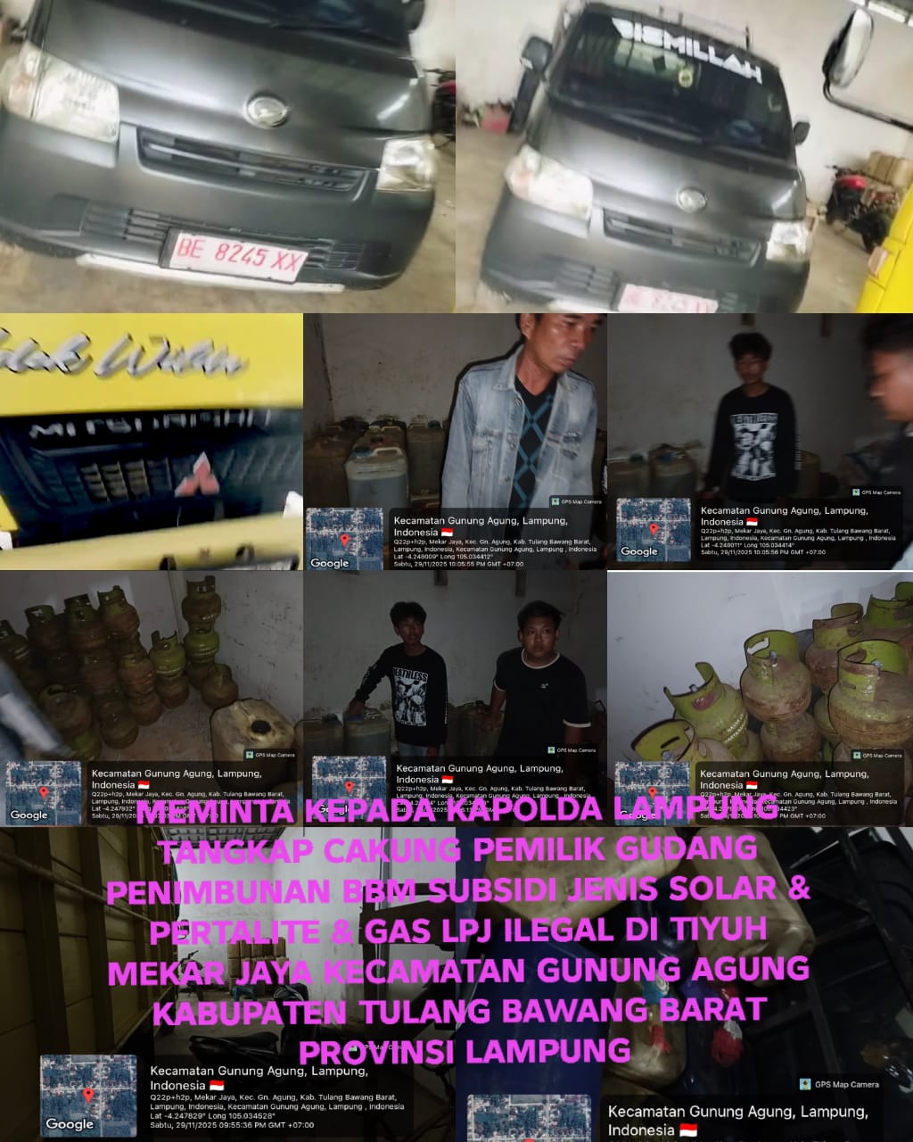Investigasi wartawan menemukan sebuah gudang di Tiuh Mekar Jaya, Kecamatan Gunung Agung, Tulang Bawang Barat, diduga milik seorang pria bernama Kacung. Dalam lokasi tersebut ditemukan:
