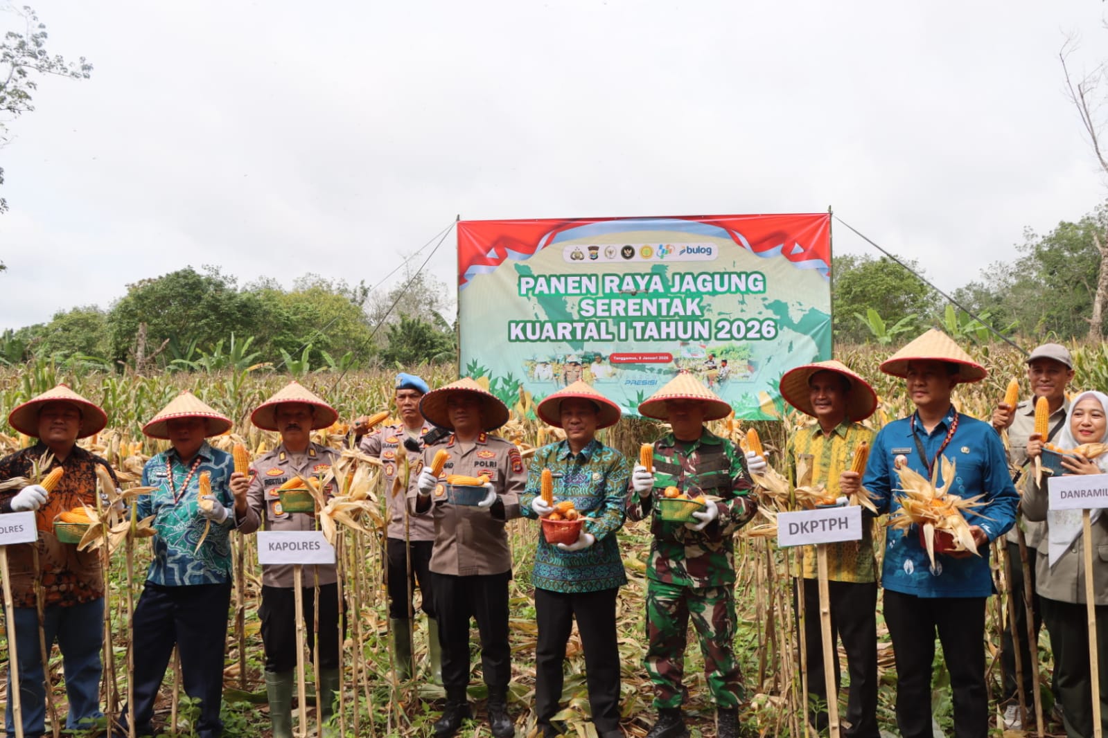 Kapolres AKBP Rahmad Sujatmiko menyampaikan bahwa panen raya jagung serentak Kuartal IV Tahun 2025, ini merupakan panen perdana di awal tahun 2026 dengan menggunakan bibit NK-Perkasa dan estimasi hasil panen mencapai 7 hingga 8 ton per hektare.