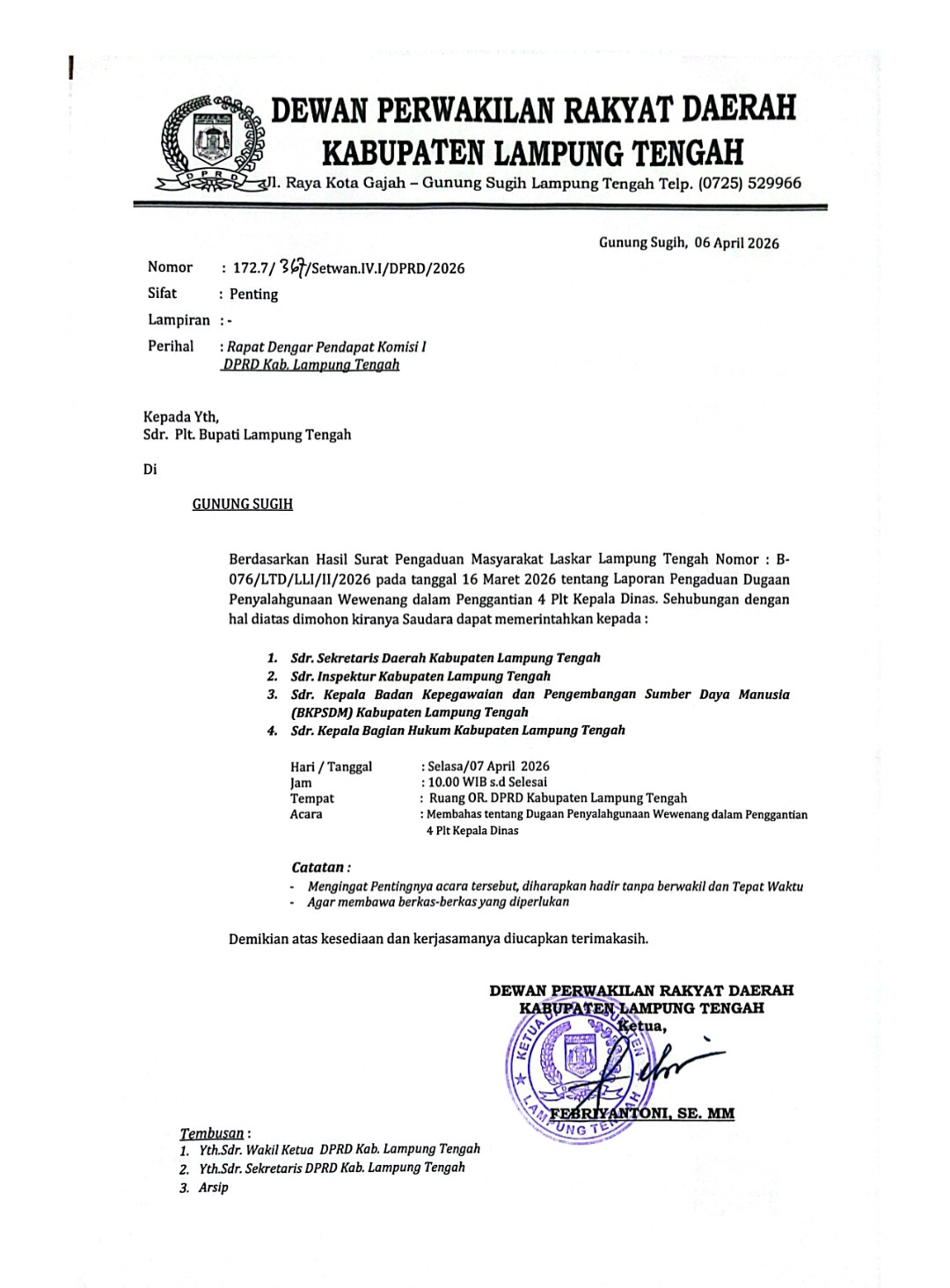 Diketahui dalam surat bernomor 172.7/367/Setwan.lV.l/DPRD/2026 itu Komisi l DPRD Lamteng, meminta Plt.Bupati, I Komang Koheri memerintahkan, Sekda Kab.Lamteng, lnspektur, Plt. Kepala BKSDM, dan Kabag Hukum Pemkab.Lamteng, untuk hadir dalam rapat dengar pendapat dengan Komisi l DPRD Lamteng, guna membahas dugaan penyalahgunaan wewenang pergantian 4 Plt.Kepala Dinas dilingkup Pemkab.Lamteng, beberapa waktu lalu.